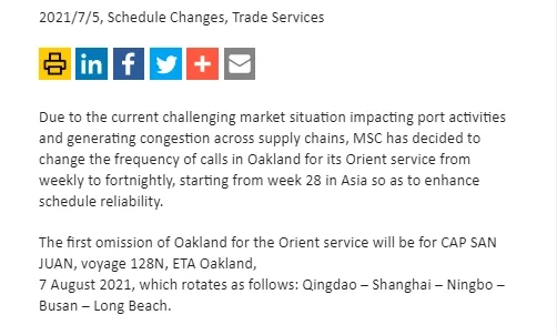 由马士基(Maersk Line)和地中海航运(MSC)组成的2M联盟将改变其TP8/Orient服务在奥克兰的挂靠频次。MSC在一份声明中称,由于当前具有挑战性的市场形势影响了港口活动,并造成供应链拥堵,TP8/Orient服务将每两周挂靠一次奥克兰港。