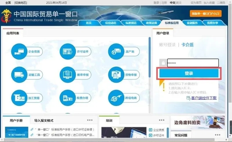 2.点击“标准版应用”,在“用户登录”栏目中选择“卡介质”,插入电子口岸卡输入卡密码后点击“登录”;