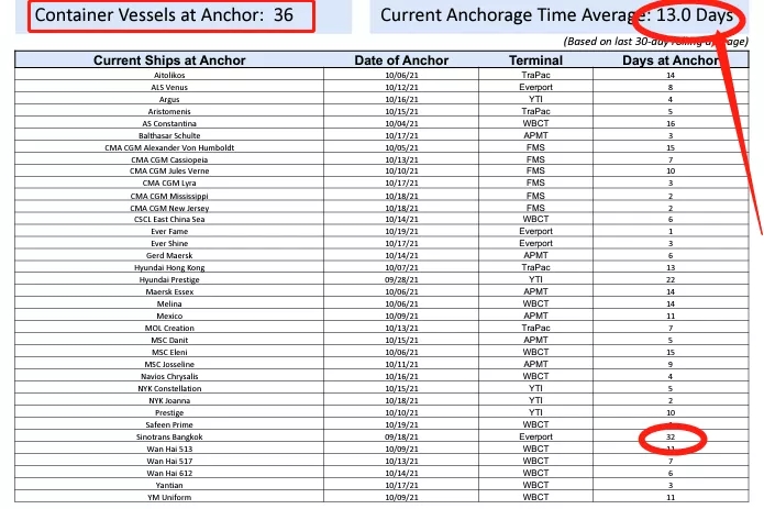 拥堵还在持续恶化,据洛杉矶港signal平台10月20日的最新数据,目前光在洛杉矶锚地等待泊位的集装箱船就达到36艘,在港外等待的船舶达到14艘,平均等待靠泊时间激增至13.0天。一艘"Sinotrans Bangkok"的集装箱船已等待靠泊达32天。货量还在继续增长。