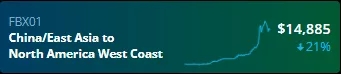 根据全球-波罗的海货柜12日最新运价指数(FBX)显示,亚洲至美西运价指数已经从9月10日每40英尺集装箱20586美元的高点价格,下降到每40英尺集装箱14885美元。与前一期11月5日18730美元相比下降3845美元,跌幅达20.5%,与9月10日高点相比,下跌5701美元,跌幅达到27.69%。