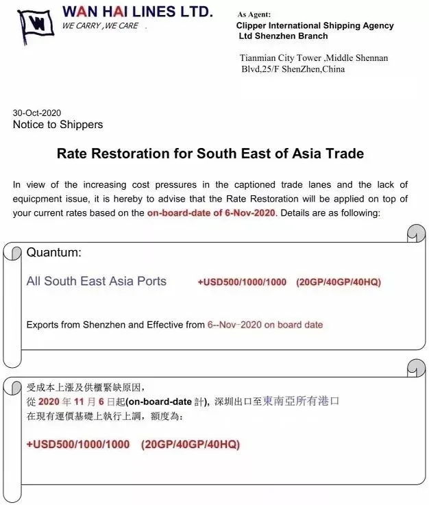 而比较意外的是运价一向平稳的东南亚航线在近期也迎来了一次大涨价,涨幅高达1000美金/柜。万海船公司此前发出通知:2020年11月6日起深圳出口至东南亚所有港口价格上调!+USD500/1000/1000。运价冲破2000$。