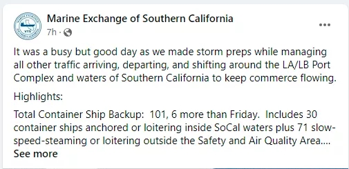 南加州海事交易所(Marine Exchange of Southern California)的最新数据显示,目前有101艘集装箱船滞留,其中30艘停泊在南加州海域,71艘在指定的安全和空气质量区域之外缓慢航行或漂泊。