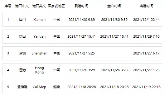 这艘11月底曾挂靠香港、深圳、盐田、厦门港的13000标准箱的“Maersk Esmeraldas”号于两天前离开厦门港(实际上12月1日已离港),目前仍停泊在离中国海岸线不远的海域,计划于1月11日抵达洛杉矶,需要一个月的中转时间,这表明了跨太平洋航线上的拥堵规模。