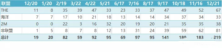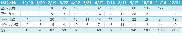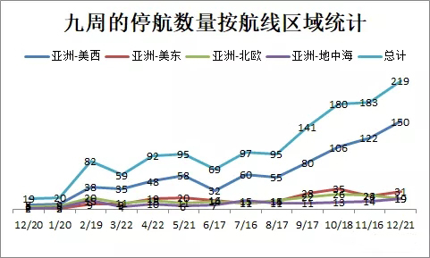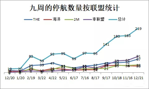 停航趋势:从去年12月开始到今年12月,每月以9周为单位汇总停航数据,根据停航数据在各区域、联盟的变化情况可以看出,今年的停航数整体要高于去年。与去年同期相比,停航数也有成倍的增长。