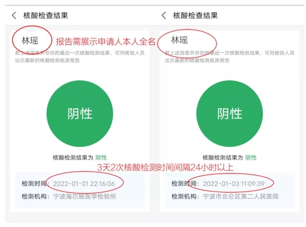 3.上传本人3天2次核酸检测阴性报告(两次检测时间需间隔24小时以上;报告截图需完整显示真实姓名),正确示例如下: