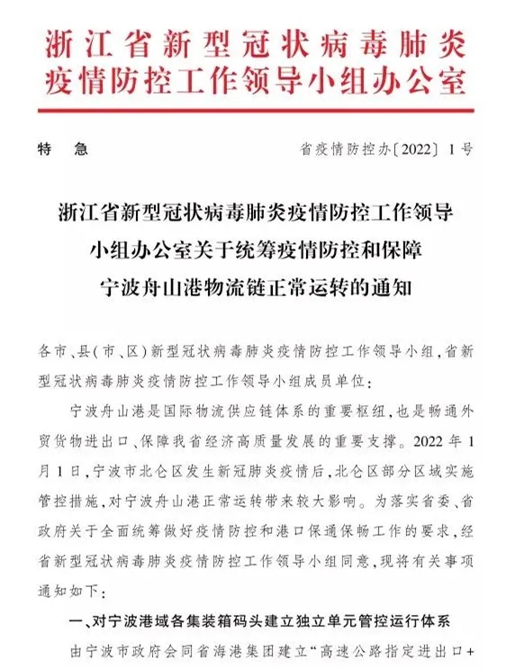 关于统筹疫情防控和保障宁波舟山港物流链正常运转的通知