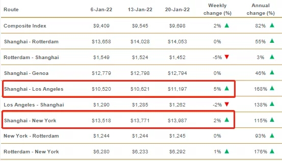 疫情恶化以及集疏运体系效能低下,导致美国港口拥堵和集装箱滞压、运输周转不畅的矛盾突出。在2月1日春节假期之前,最近一周至美西、美东航线的船舶平均舱位利用率基本保持满载,节前航次的优先运输市场势头强劲,优先运输价格也随之上升,至美西的集装箱现货运价更是大幅上涨。