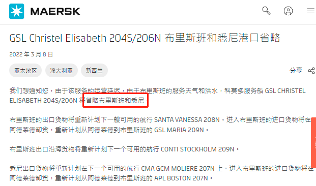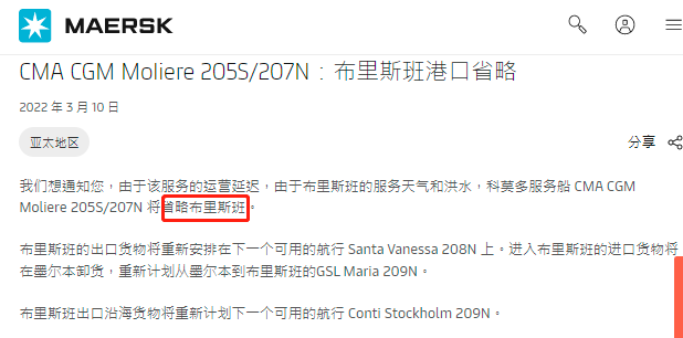 此外,船公司马士基于于8日和10日分别发布公告表示,由于布里斯班的天气和洪灾,服务运营延迟,科莫多服务船GSL CHRISTEL ELISABETH 204S/206N将跳港布里斯班和悉尼港。科莫多服务船CMA CGM Moliere 205S/207N将跳港布里斯班。