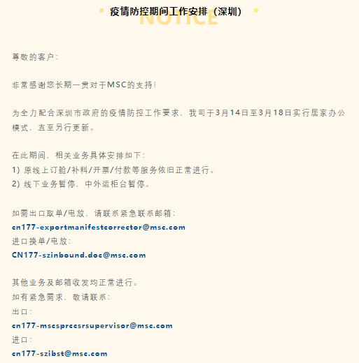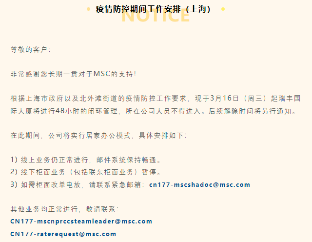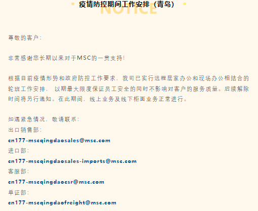 MSC上海、青岛、深圳疫情防控期间工作安排