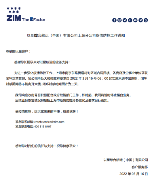 阳明海运上海分公司3月16日发布公告,上海办公室配合政府疫情管控措施进行隔离封闭,禁止所有人员进出。