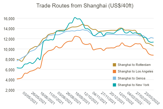 上海仍处于封控中,部分区域有可能在近期解封。华东和华北地区的其他城市也出现病例。工厂生产、仓库和卡车运输服务供应受到影响,不过港口码头和卡车运输仍在全面运行。所有海运联盟的不分货类运价和即期运费舱位都有供应,但承运商仍在限制长期大客户交易。为应对近期形势变化,预计承运商可能会公布跳港和空行措施。海运费仍处于高位,但由于市场放缓,3月份之后到4月份开始时价格整体呈现下降趋势。