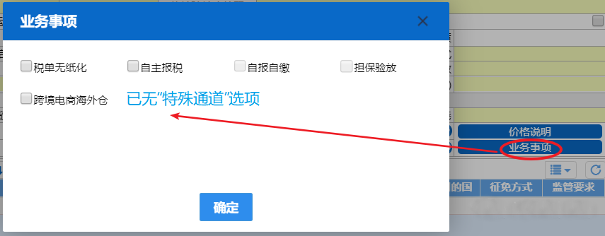 取消后,报关单表头业务事项栏已不再显示特殊通道选项。