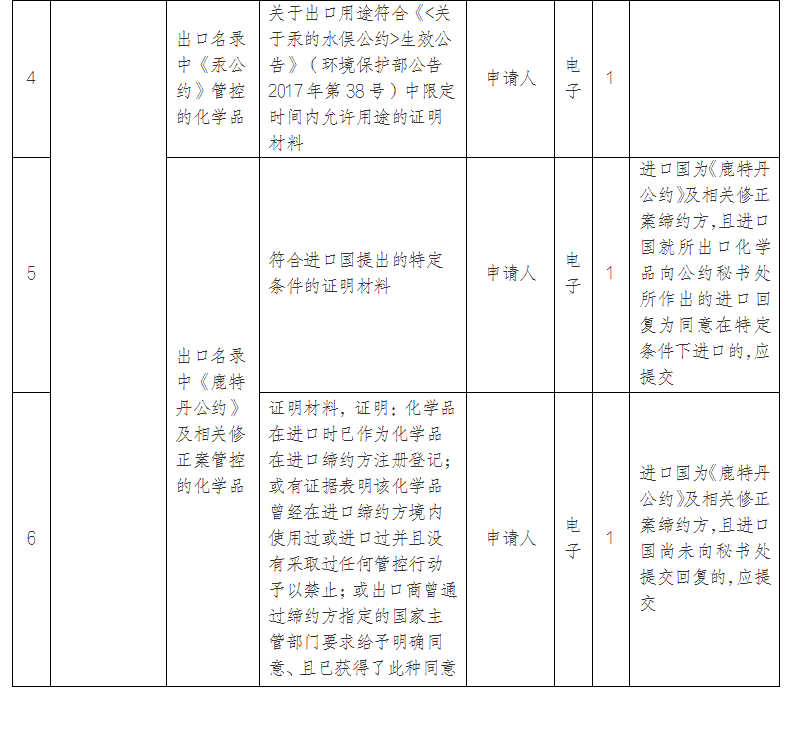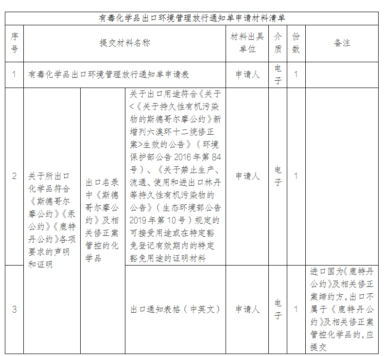 凡进出口列入《中国严格限制的有毒化学品名录》的化学品,均须办理有毒化学品进(出)口环境管理放行通知单。主要包括全氟辛基磺酸及其盐类和全氟辛基磺酰氟(PFOS/F)、六溴环十二烷、汞、四甲基铅、四乙基铅、多氯三联苯(PCT)、三丁基锡化合物、短链氯化石蜡8大类产品,详见《关于印发〈中国严格限制的有毒化学品名录〉(2020年)的公告》(生态环境部、商务部、海关总署公告 2019年第60号)。