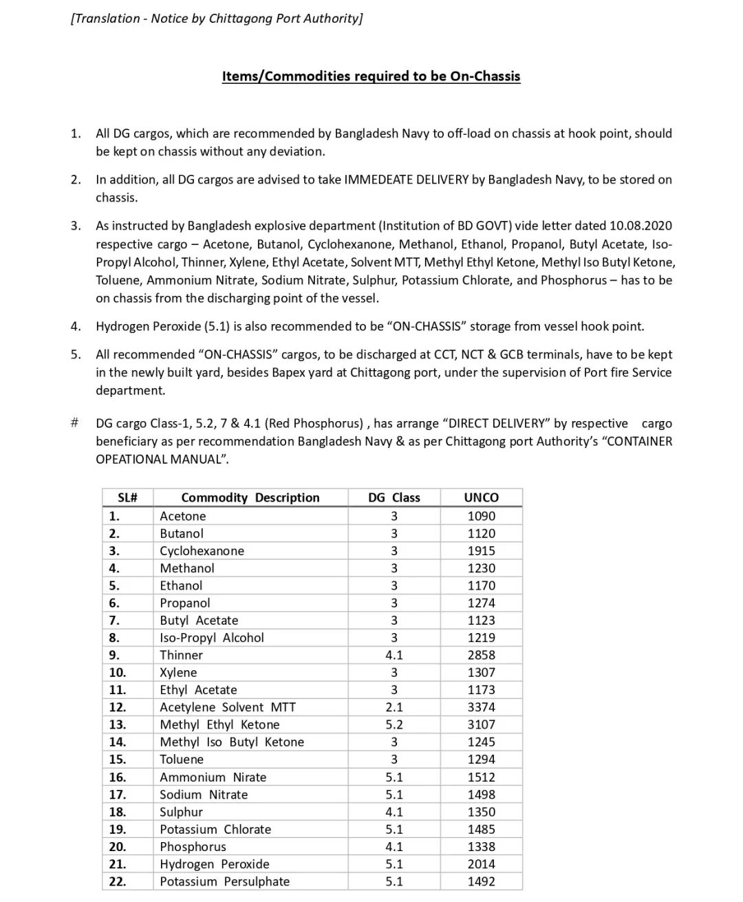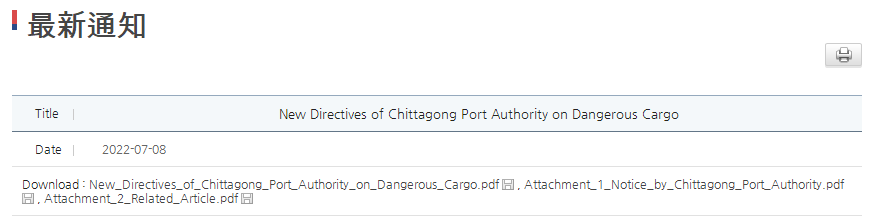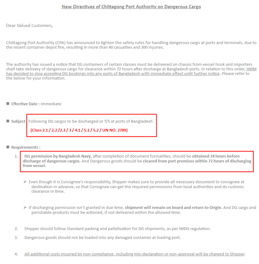 鉴于此次事故,吉大港港务局发布了港口新规,对涉及危险品货物要求提供对应的proper shipping name, IMCO, UN#,并显示在货描的前五行。吉大港港务局已向港口用户发布了多条指令,其中包括在抵达后3天内提离危险品集装箱/货物。