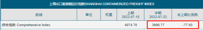 SCFI:上海航运交易所最新一期公布的集装箱运价指数(SCFI)下跌1.9%至3996.77点,跌破4000点。