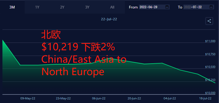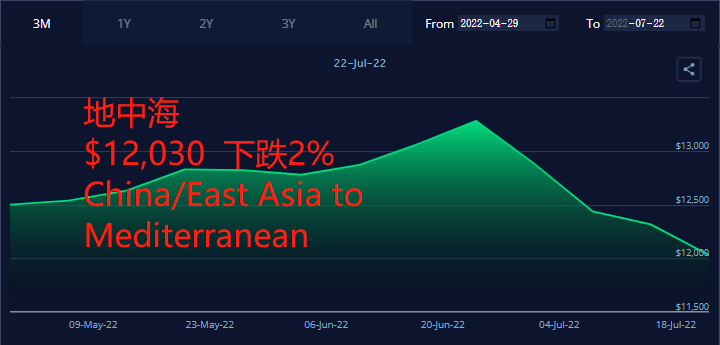 欧洲和地中海航线近几周连续下跌。最新一期都下跌2%分别至10219美元/FEU、12030美元/FEU。