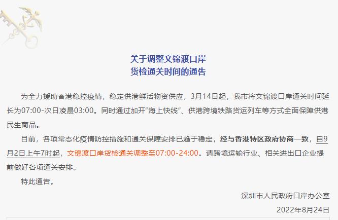 注意!深圳文锦渡口岸货检通关时间将调整,9月2日起执行