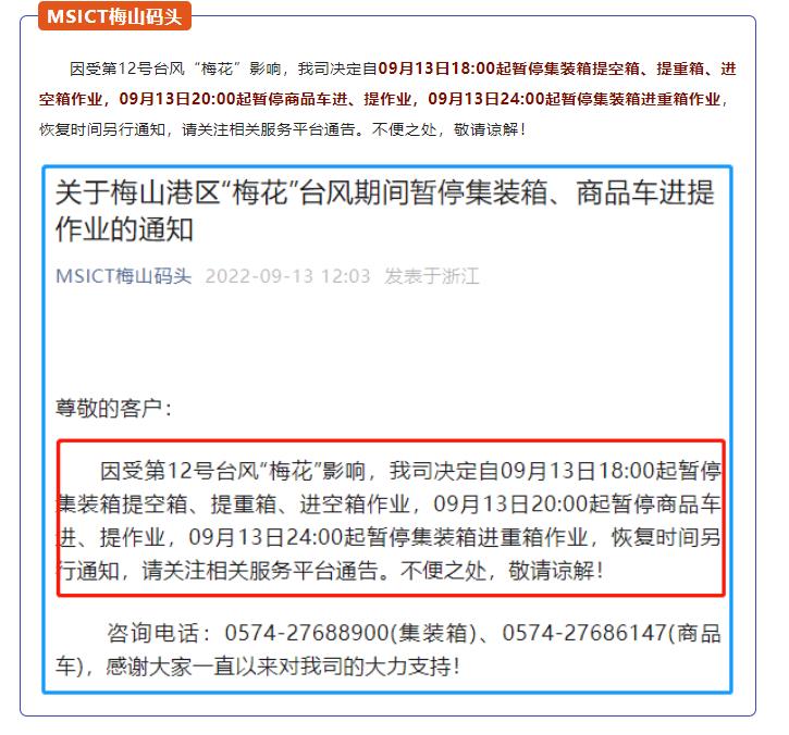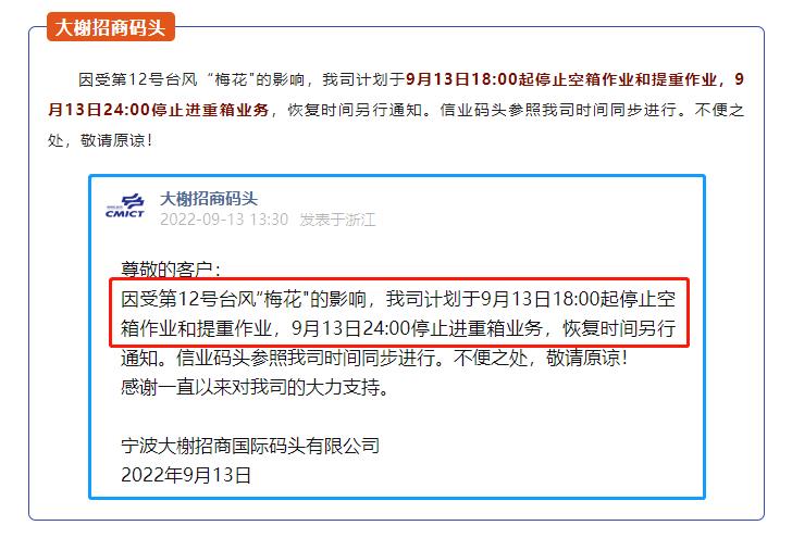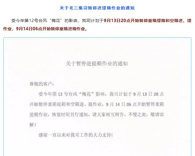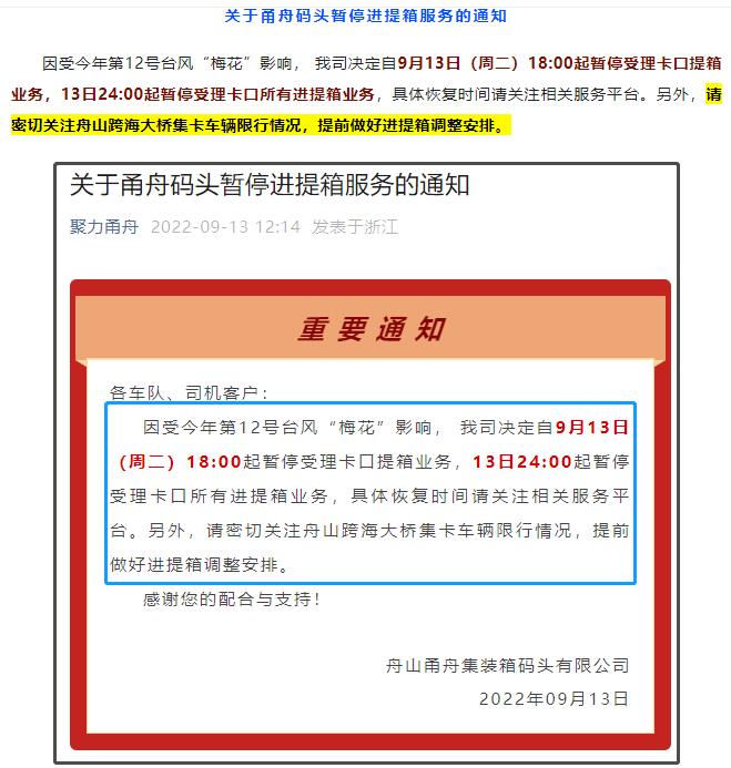 目前宁波大榭招商码头、梅山码头、甬舟码头、大麦屿码头、北仑第一、二、三集装箱码头等已发布暂停进提箱作业的相关通知。有做箱计划,请合理安排。