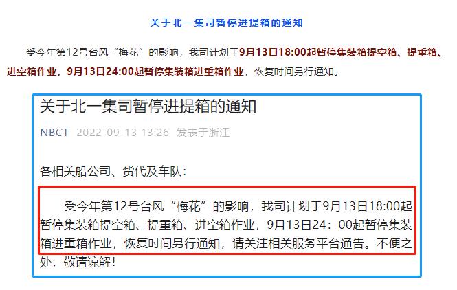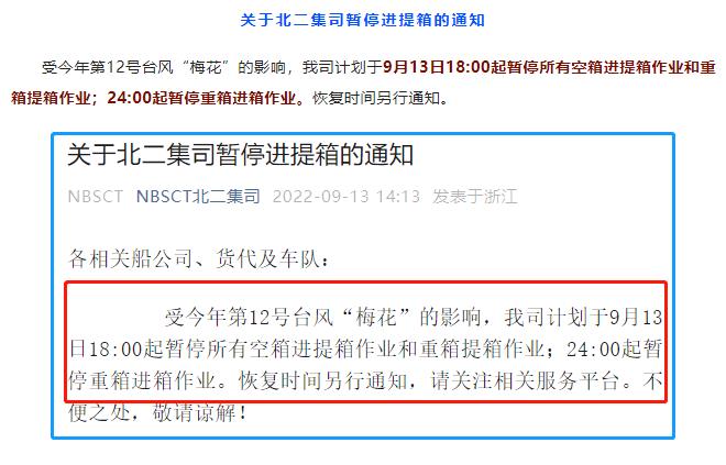 受此影响,目前宁波、上海各大码头、堆场陆续通知,暂停进提箱作业。接下来船期或将受到影响。