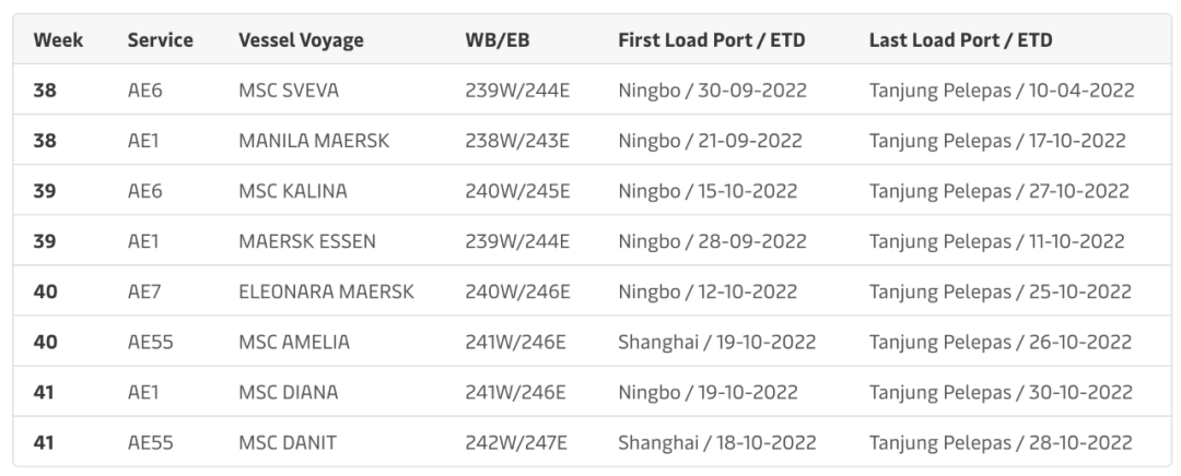 - 安特卫普港:替代为AE6航线