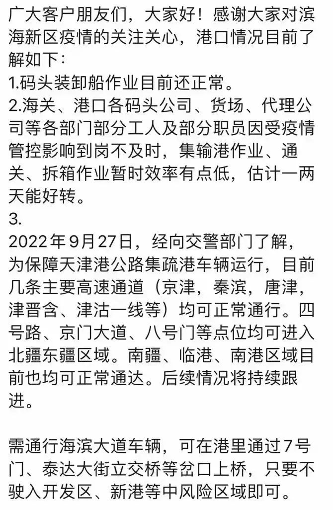 目前,经向交警部门了解,为保障天津港公路集疏港车辆运行,目前几条主要高速通道(京津,秦滨,唐津,津晋含、津沽一线等)均可正常通行。四号路、京门大道、八号门等点位均可进入北疆东疆区域。南疆、临港、南港区域目前也均可正常通达。后续情况将持续跟进。