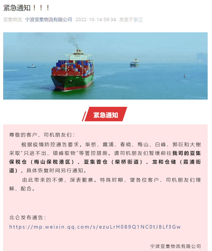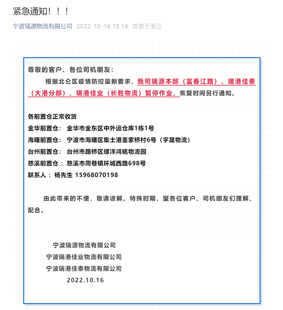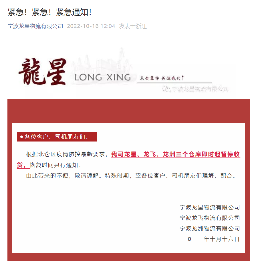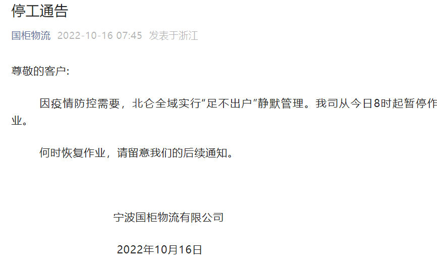 10月16日,宁波市北仑区发布关于提级临时性全域静默管理的通告。为切实巩固疫情防控成果,宁波港多家物流公司积极响应疫情防控最新要求,相继宣布暂停进仓。