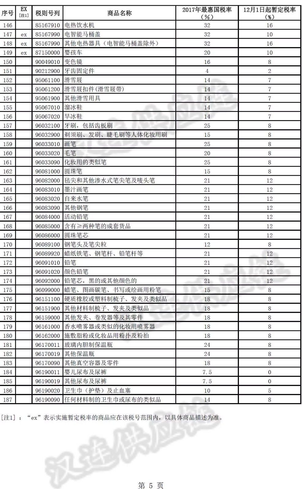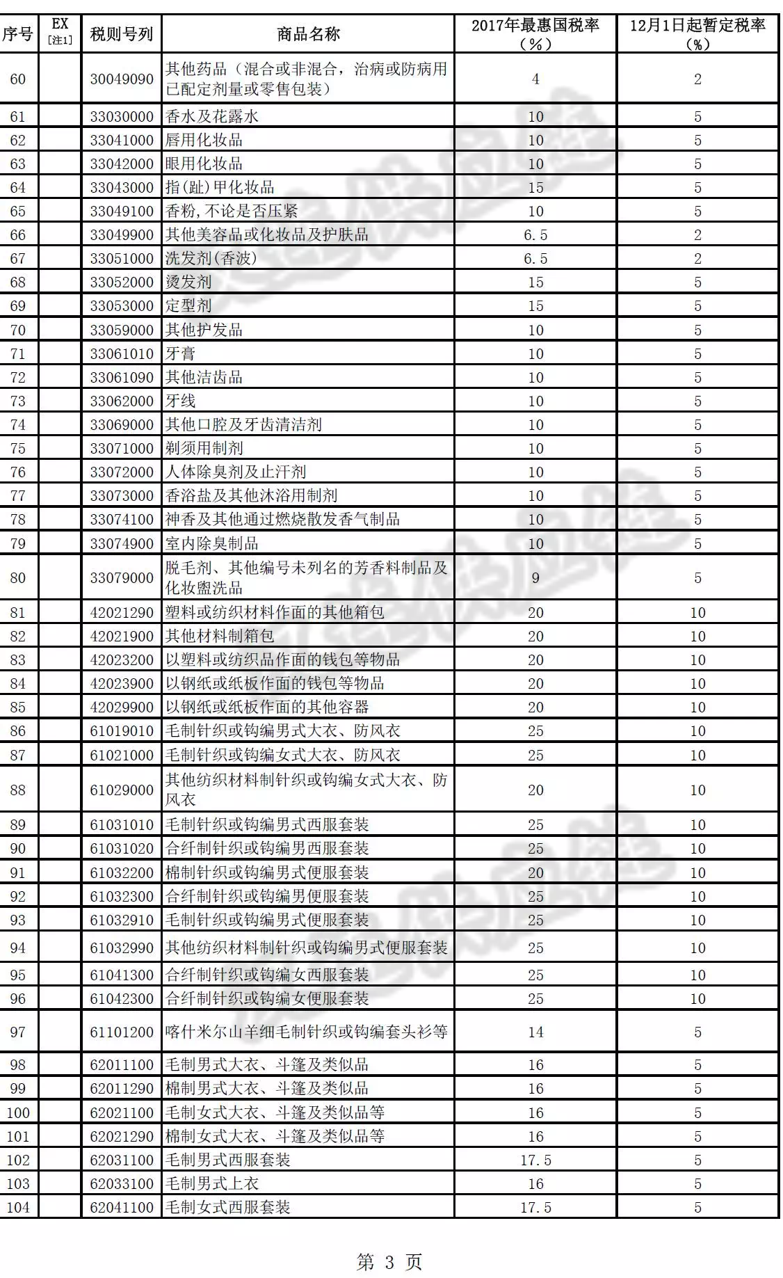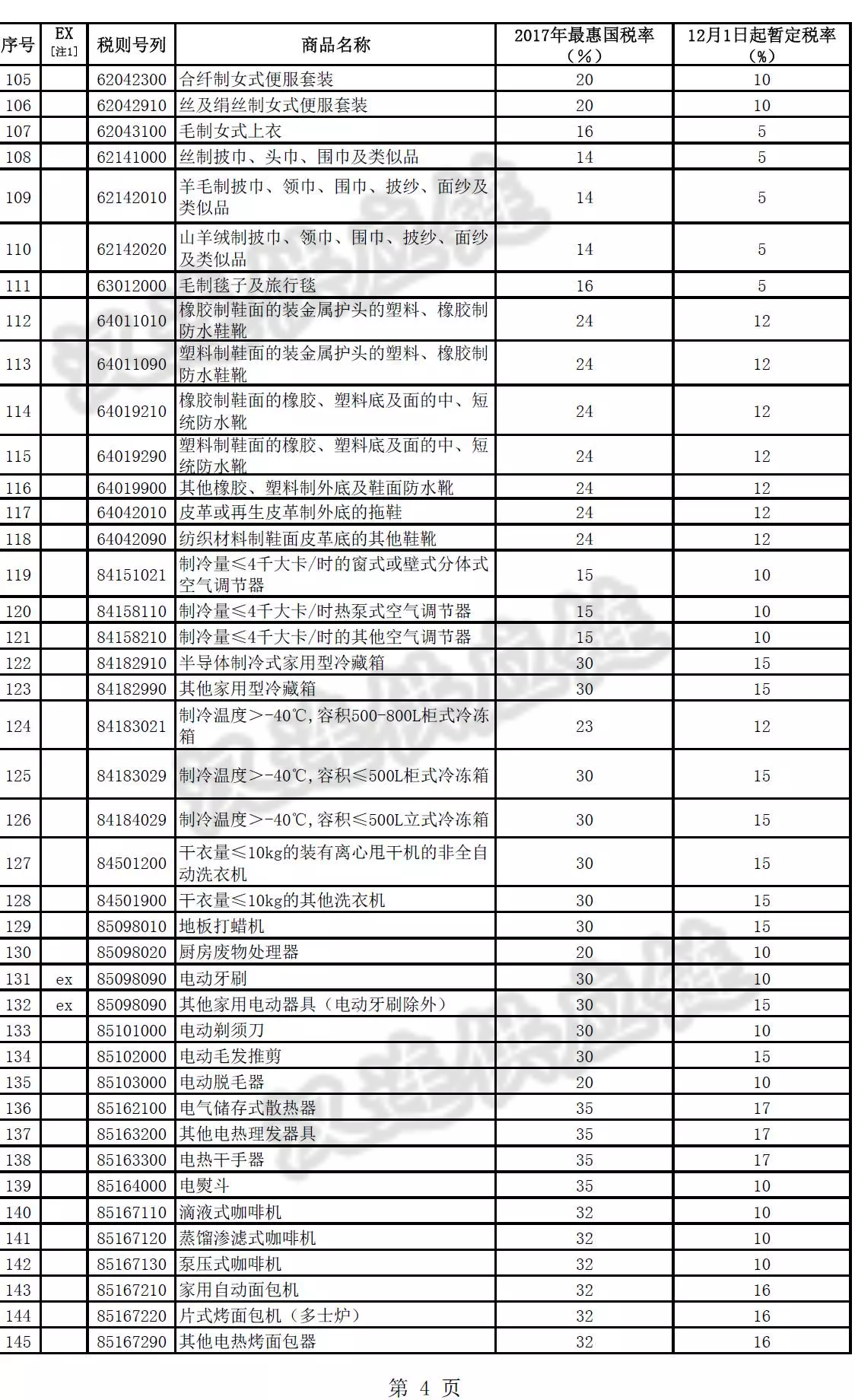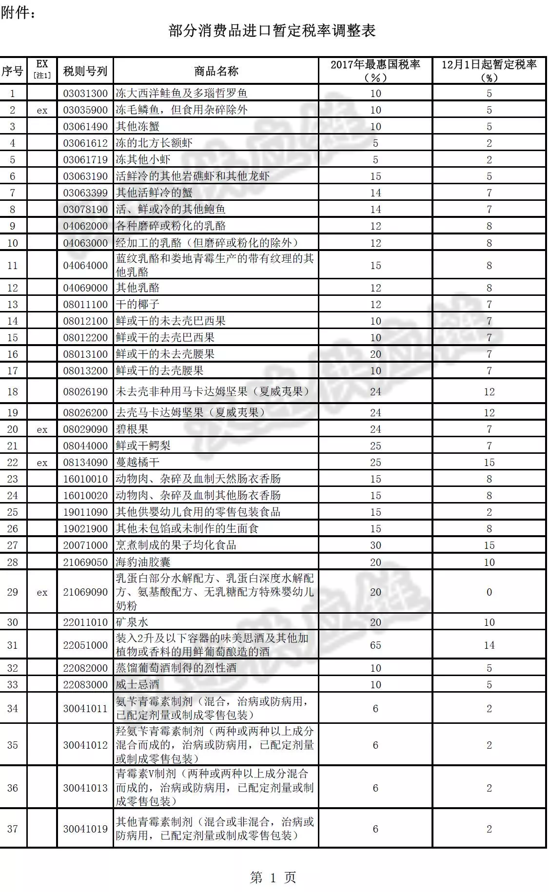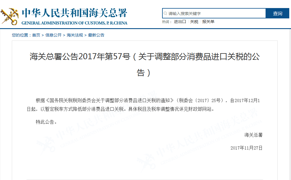 根据国务院要求,自2015年以来,为满足居民消费升级需要,合理增加与人民生活密切相关的一般消费品进口,我国已陆续4次降低了部分服装、箱包、鞋靴、特色食品和药品等消费品的进口关税。到2017年11月,我国已对152个税号的消费品实施了暂定税率,平均降幅为50%,涉及一般贸易年进口额109亿美元。