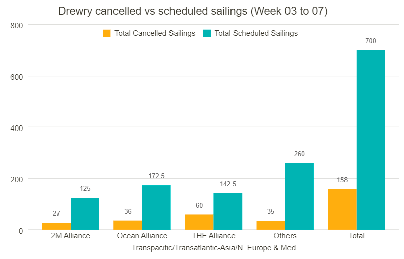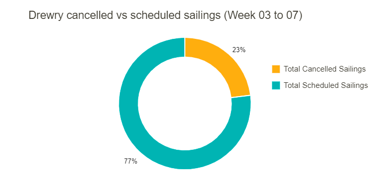 根据德路里最新数据显示,在跨太平洋、跨大西洋和亚洲至北欧和地中海的主要贸易航线的总共700个预定航次中,在第7周(1月16日至22日)到第7周(2月13日至19日)的5周间取消了158个航次,取消率占23%。