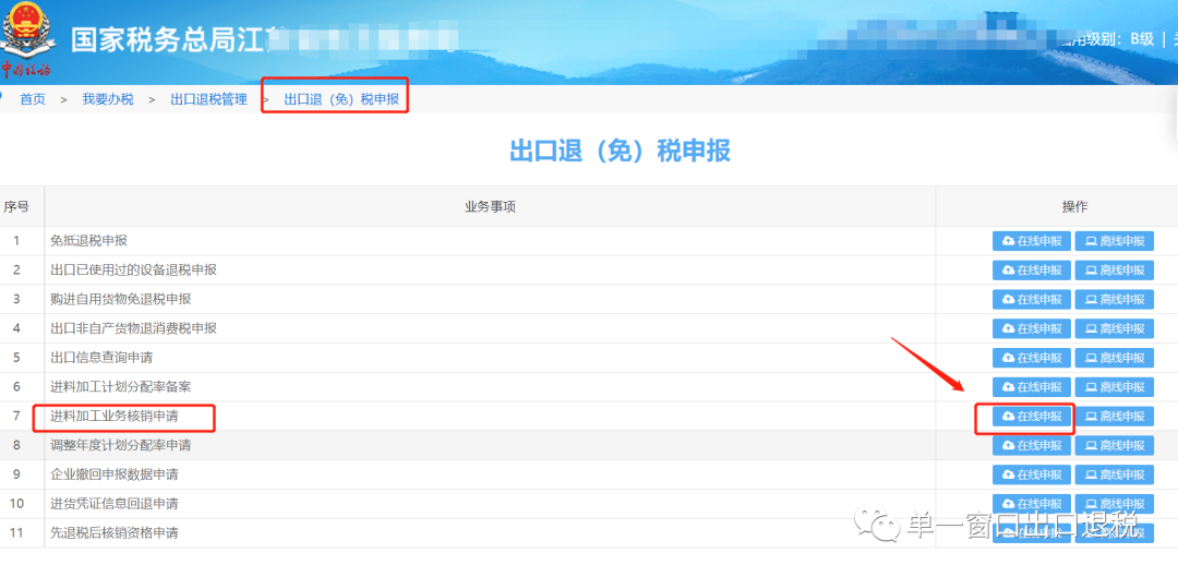 2.点击左侧【出口退税申报】,选择右侧序号8【进料加工业务核销申请】的离线申报功能。