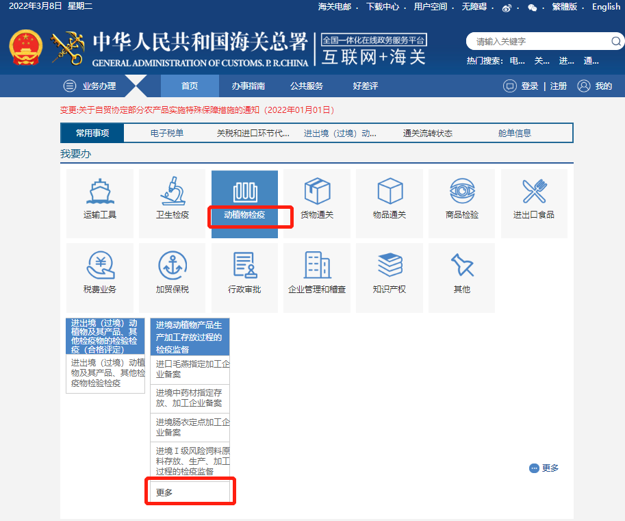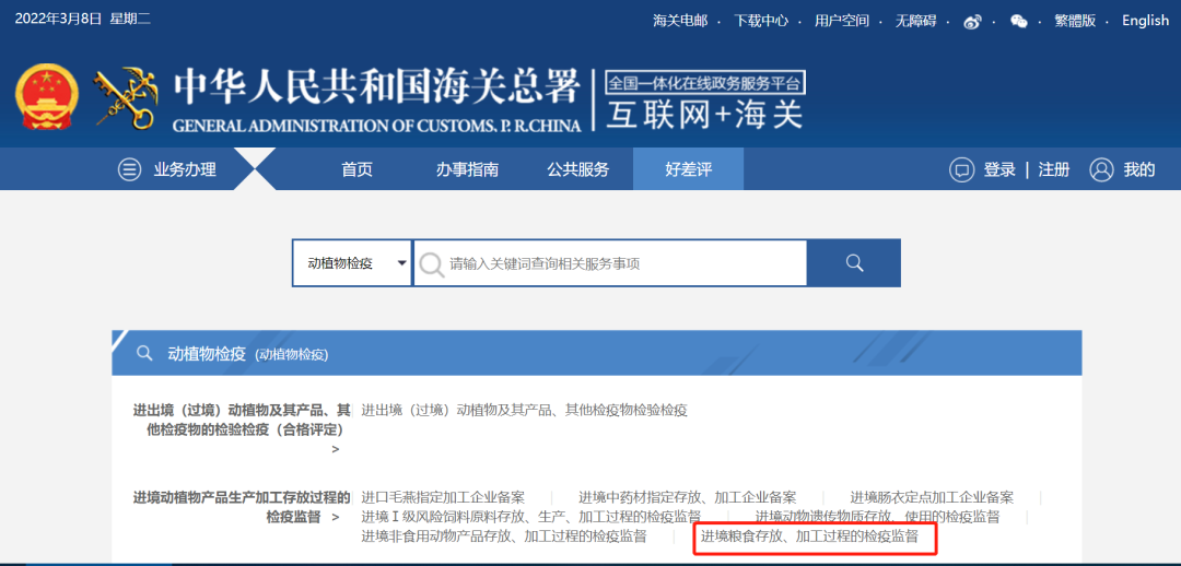 方式一:登录“互联网+海关”一体化网上办事平台→动植物检疫→更多→进境粮食存放、加工过程的检疫监督。