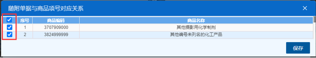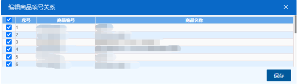 其中,商品项号关系信息填报单个集装箱对应的商品项号,半角逗号分隔。例如:“MSMU7514707”箱号的集装箱中装载了项号为1-6的商品时,应在“商品项号关系”录入“1,2,3,4,5,6”。(也可点击商品项号关系右侧的展开按钮进入“编辑商品项号关系”对话框,勾选对应序号。)