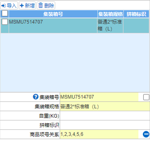 当使用集装箱装载货物时,需填报集装箱体信息,包括集装箱号、集装箱规格、拼箱标识、商品项号关系。