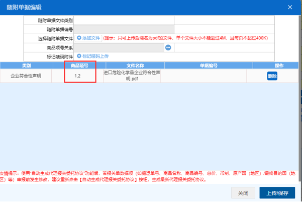 危险化学品进口报关单新增“80000001-企业符合性声明、80000002-抑制剂或稳定剂情况说明、80000003-危险公示标签、80000004-安全数据单”四类随附单据,随附单据选择上述类型时需录入商品项号对应关系。