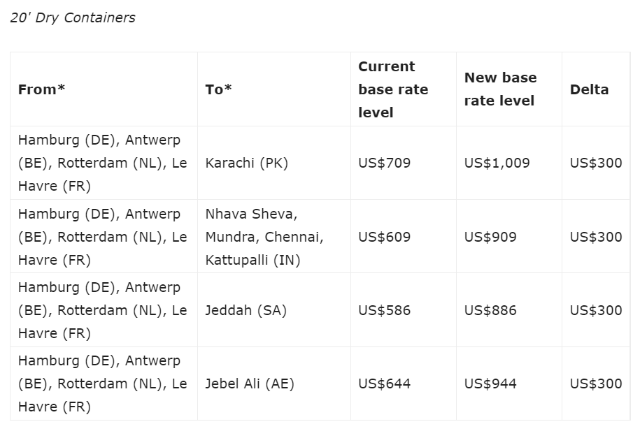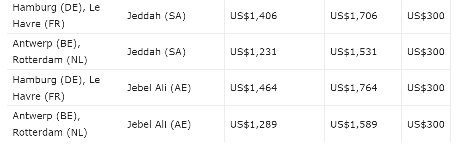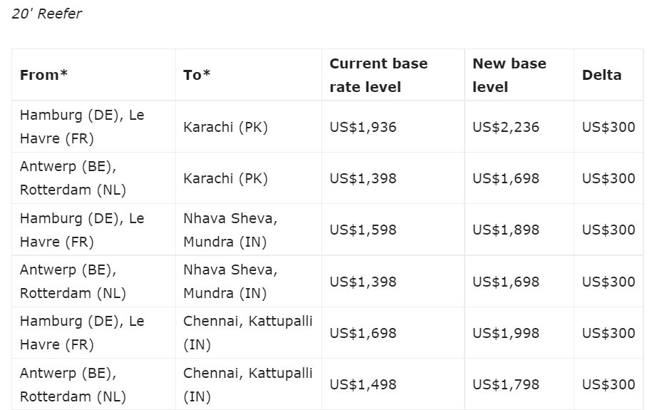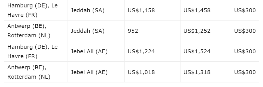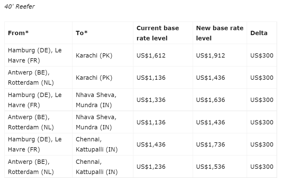 同时,12月1日起,从北欧到印度、巴基斯坦、红海和阿拉伯湾地区的运费,涉及20英尺和40英尺干箱、冷藏集装箱、高箱,具体调整如下: