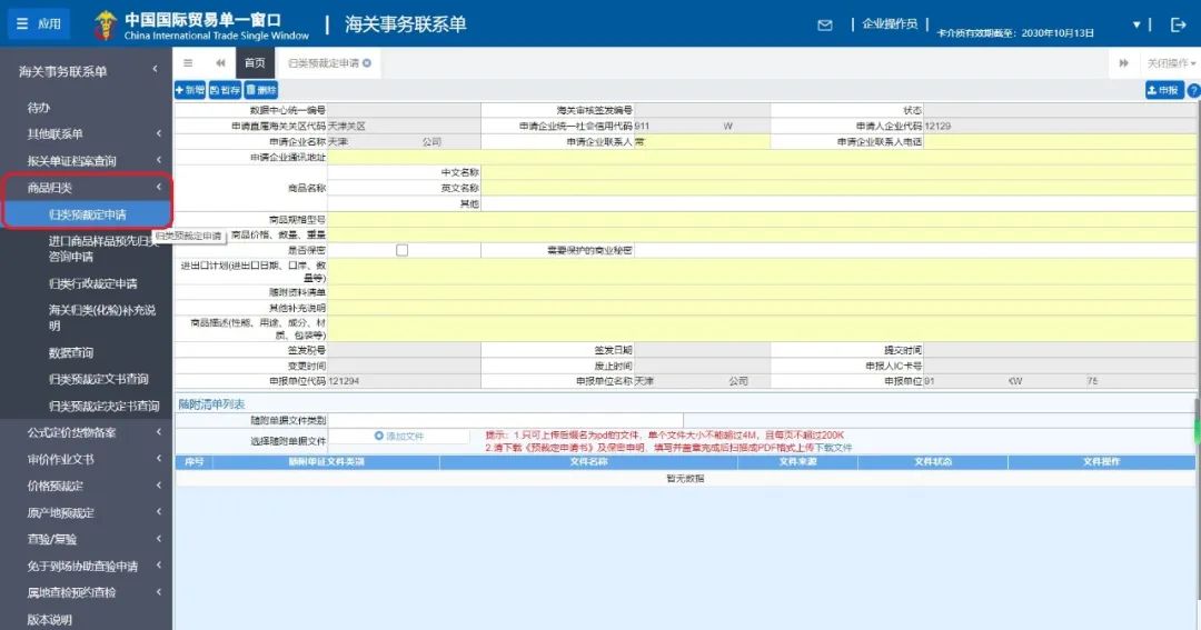 申请人通过“中国国际贸易单一窗口-标准版应用-货物申报-海关事务联系系统-海关事务联系单-商品归类-归类预裁定申请”提交归类预裁定申请电子数据。