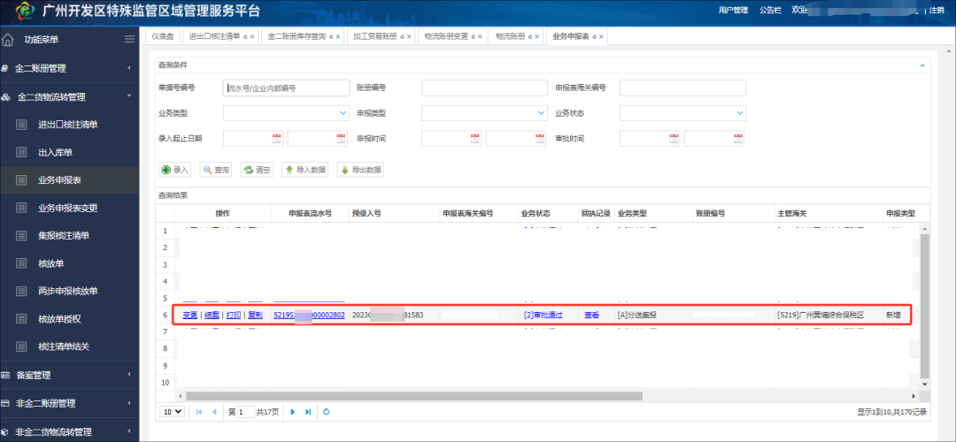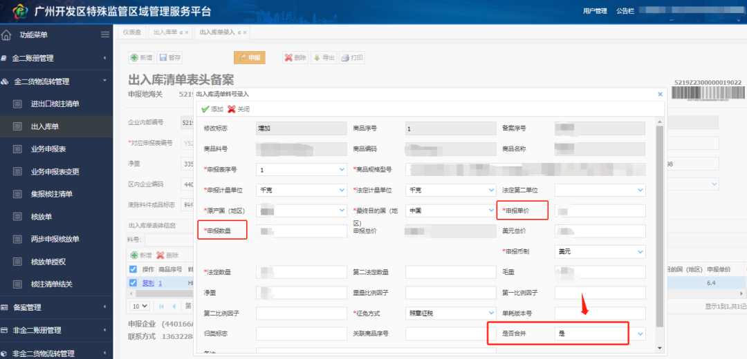 货物分批送货出区前,区内企业可以申报一个或多个金关二期系统出库单,出库单应录入对应申报表编号,业务类型栏填报“分送集报”,出入库单类型栏填写“出区”,净重、毛重、件数等要素按货物实际填报,表体从业务申报表调取货物信息后填报本批次出区数量、单价等。