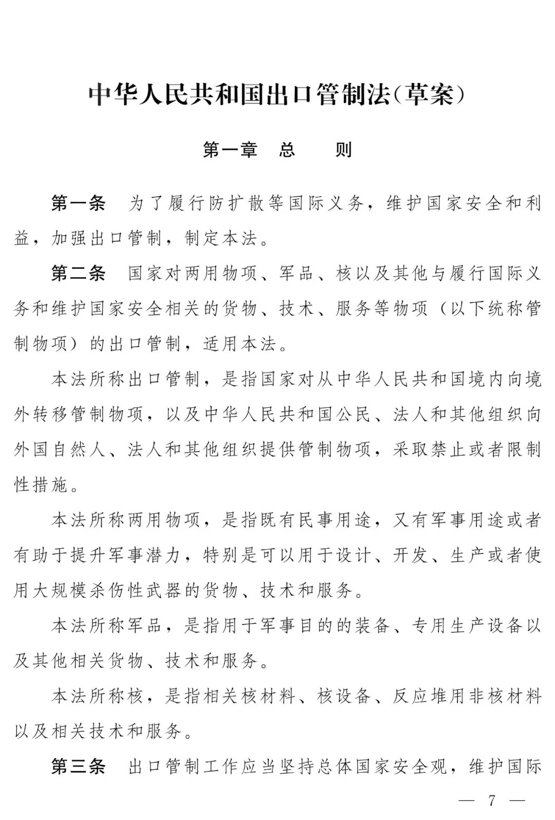以下为《中华人民共和国出口管制法(草案)》全文: