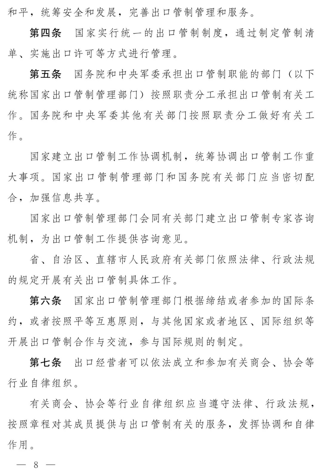 出口管制,是指一国为履行防扩散等国际义务、维护国家安全和发展利益等目的,对核、生物、武器等特定物项的出口采取禁止或者限制性措施,是国际通行做法。我国此前制定了监控化学品管理条例、核出口管制条例、军品出口管理条例、核两用品及相关技术出口管制条例、导弹及相关物项和技术出口管制条例、生物两用品及相关设备和技术出口管制条例等6部有关出口管制的行政法规。