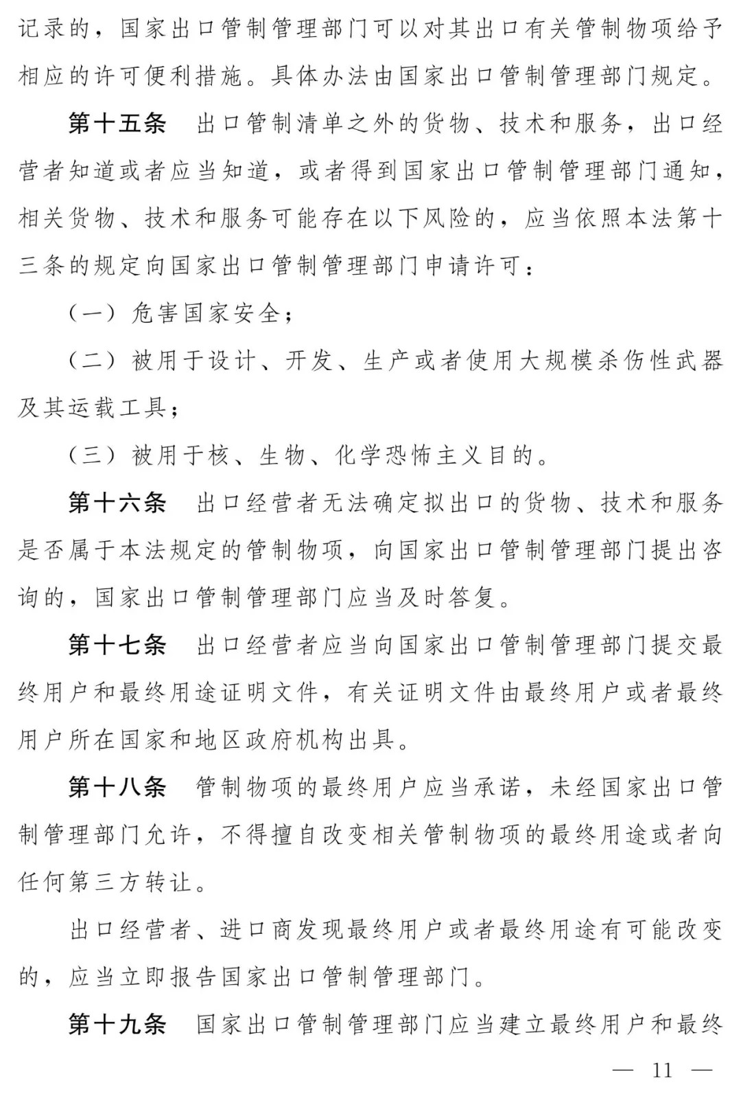 值得一提的是,按照“放管服”改革要求,草案在严格出口管制的同时尽可能方便企业。比如,草案规定对出口经营者可以依法实行备案管理,对内部合规审查制度运行情况良好、没有重大违法记录的出口经营者,可以给予相应的许可便利措施等。