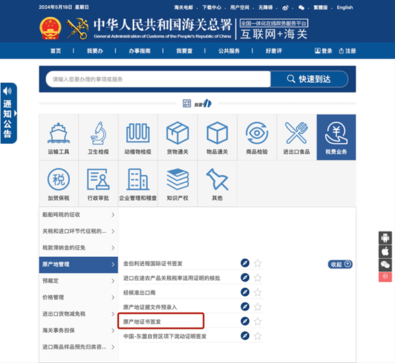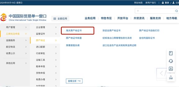 海关对出口货物原产地证书的申领已基本实现电子化,申请人只需要登录“互联网+海关”的“原产地证书签发”或者中国国际贸易单一窗口,进入“海关原产地证书”模块即可办理出口原产地证书业务。