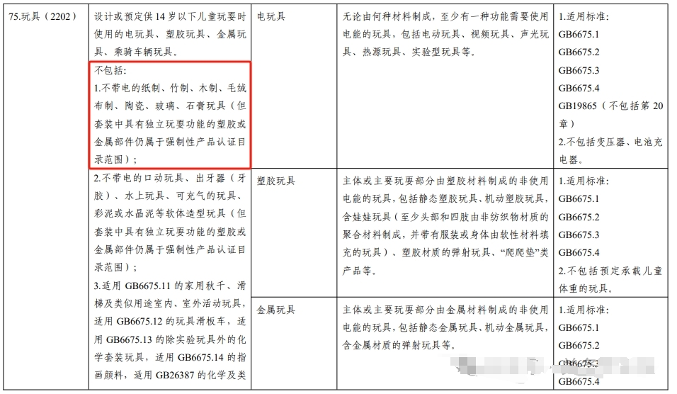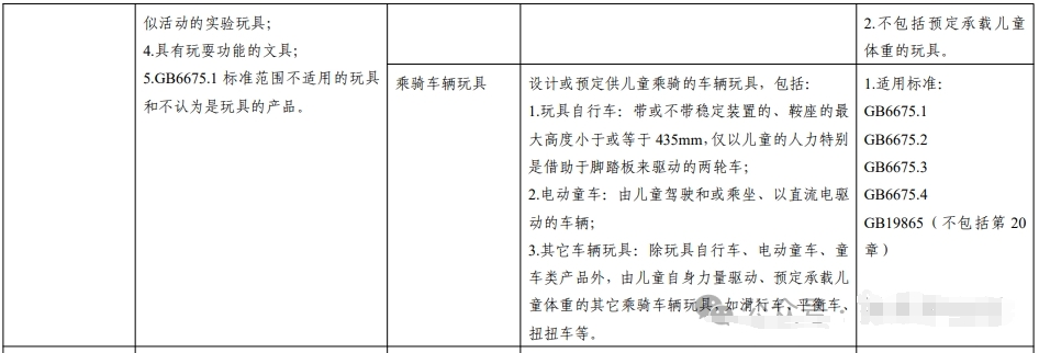 市场监管总局办公厅同步发布的还有一份《强制性产品认证目录描述与界定表》(点击文末左下角可下载完整版),表格中清晰地界定哪些产品属于强制性认证范围。具体来看,玩具类包括设计或预定供 14 岁以下儿童玩耍时使用的电玩具、塑胶玩具、金属玩具、乘骑车辆玩具。其中特别指出,强制性产品认证不包括不带电的纸制、竹制、木制、毛绒布制、陶瓷、玻璃、石膏玩具(但套装中具有独立玩耍功能的塑胶或金属部件仍属于强制性产品认证目录范围)。