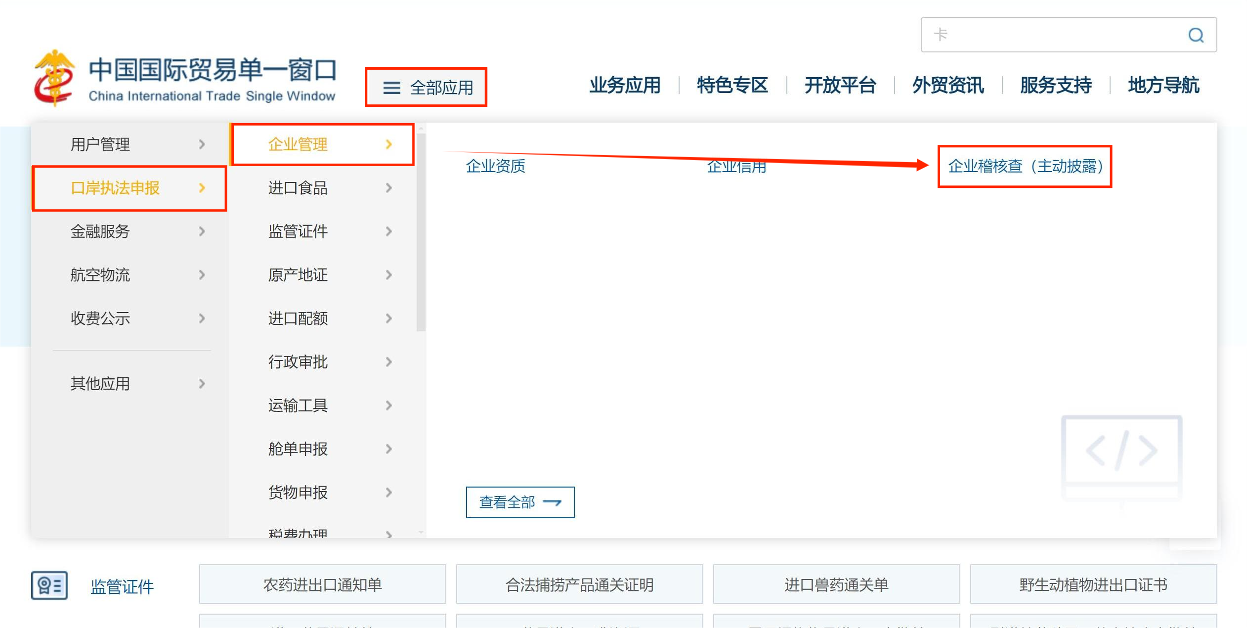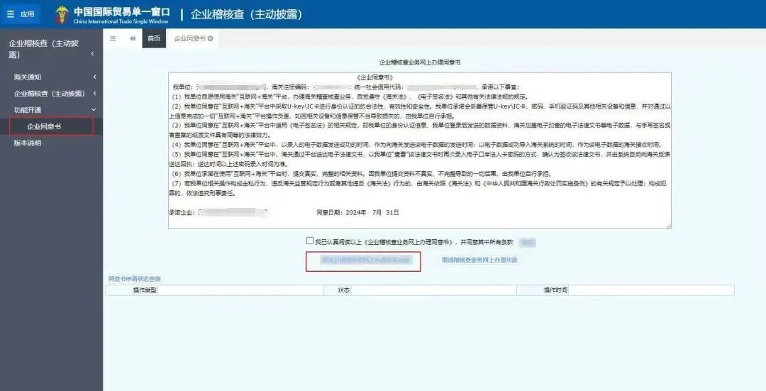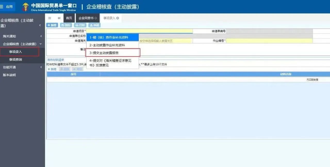 3.登录中国国际贸易单一窗口→业务应用→企业管理→企业稽核查(主动披露)→同意开通稽核查网上办理功能→事项录入,申请项目中选择“3-提交主动披露报告”→根据系统要求进行信息及附件录入