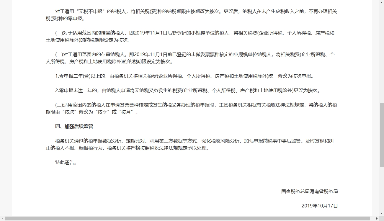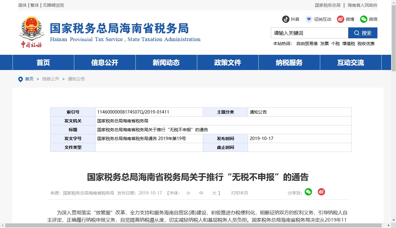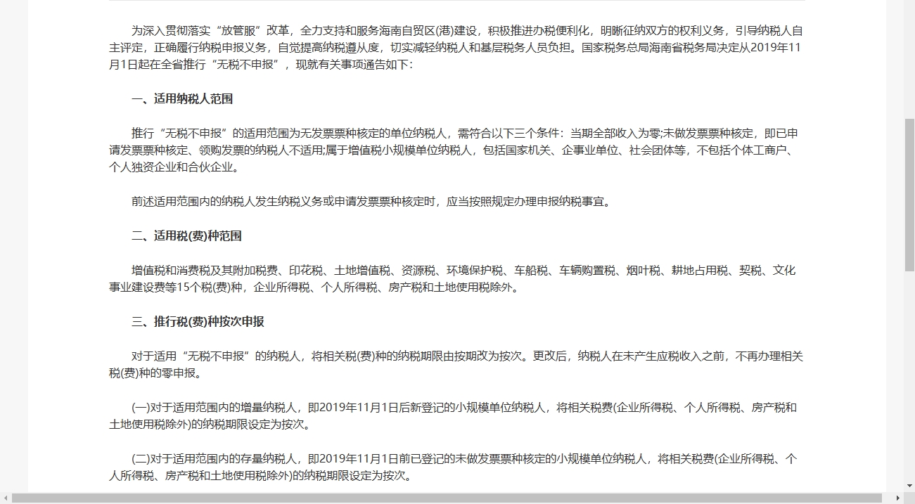 海南省税务局发布《关于推行无税不申报办法的公告》,打响了无税不申报的第一枪。