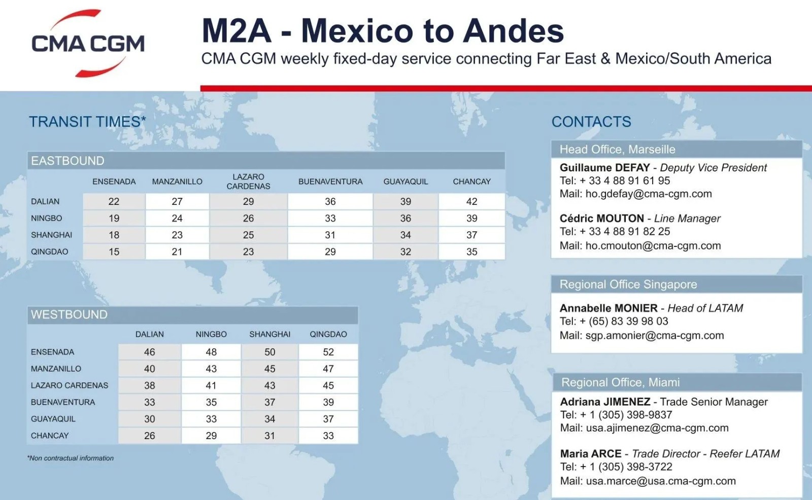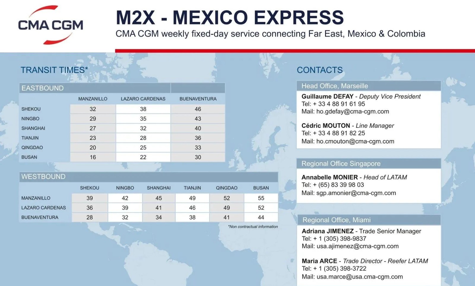 同时,M2X航线将通过在布埃纳文图拉港和拉萨罗卡德纳斯港中转,实现与中美洲西岸航线的衔接,并依托三条新开通的MAYA环线,确保提供通达该地区主要港口的可靠班轮服务。