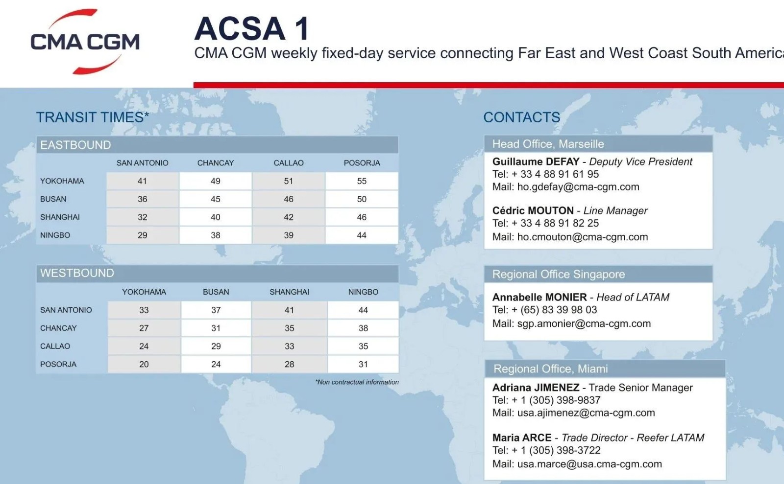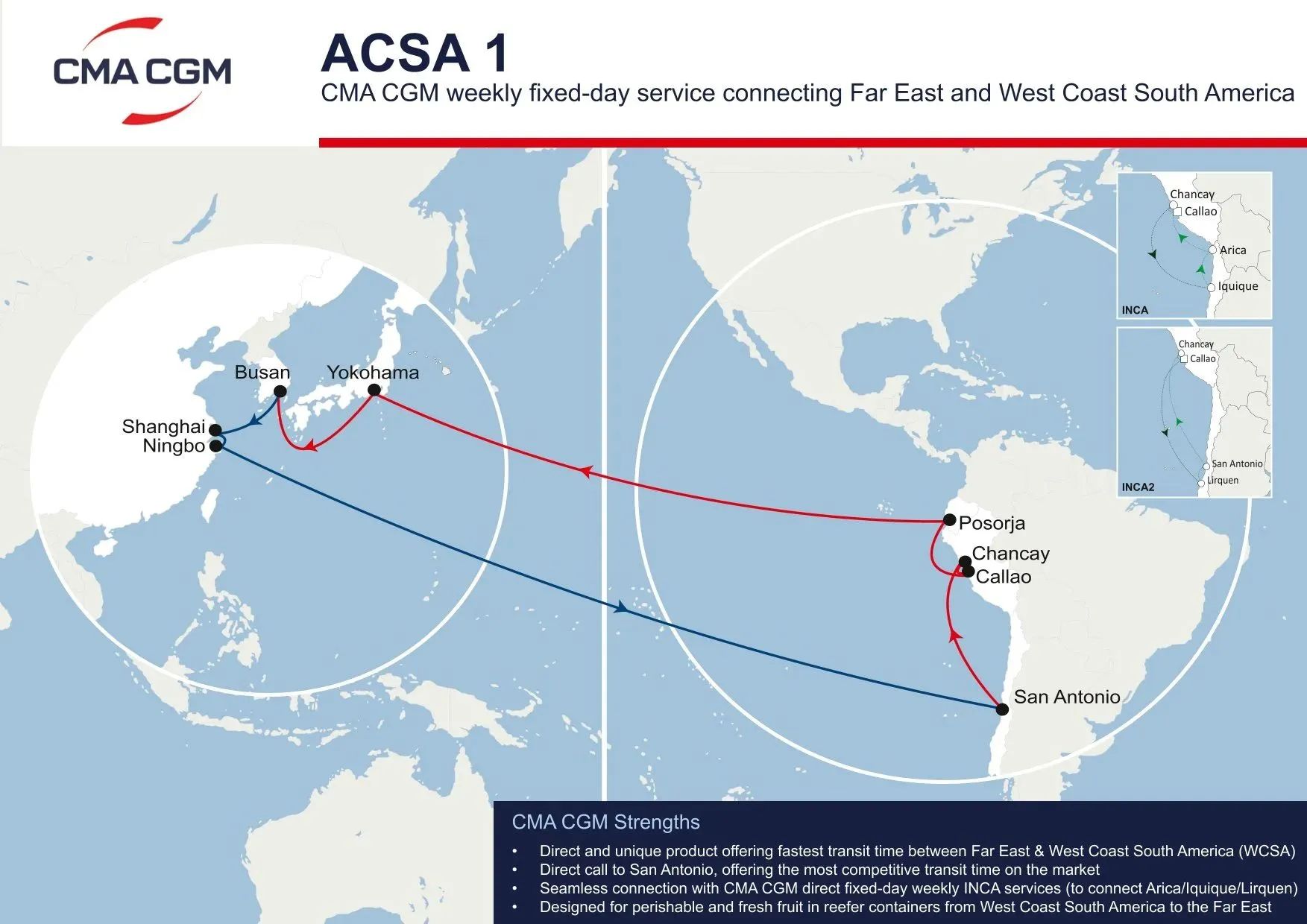 新ACSA1航线挂靠港序为:釜山港(韩国)-上海港(中国)-宁波港(中国)-圣安东尼奥港(智利)-钱凯港(秘鲁)-卡亚俄港(秘鲁)-波索尔哈港(厄瓜多尔)-横滨港(日本)。