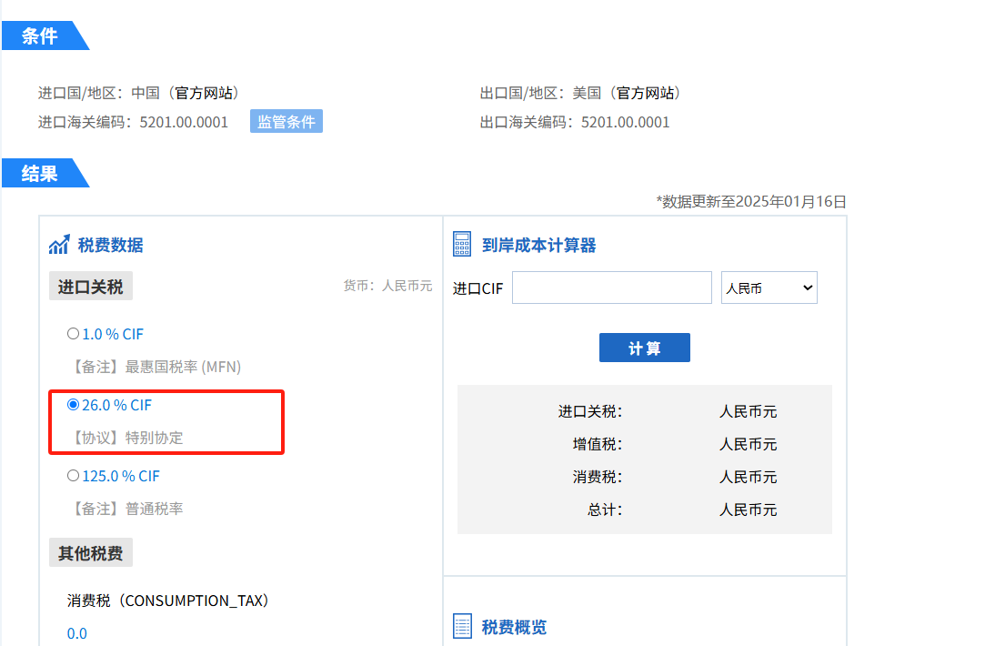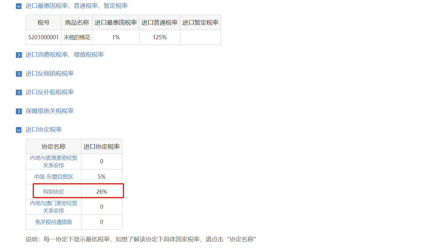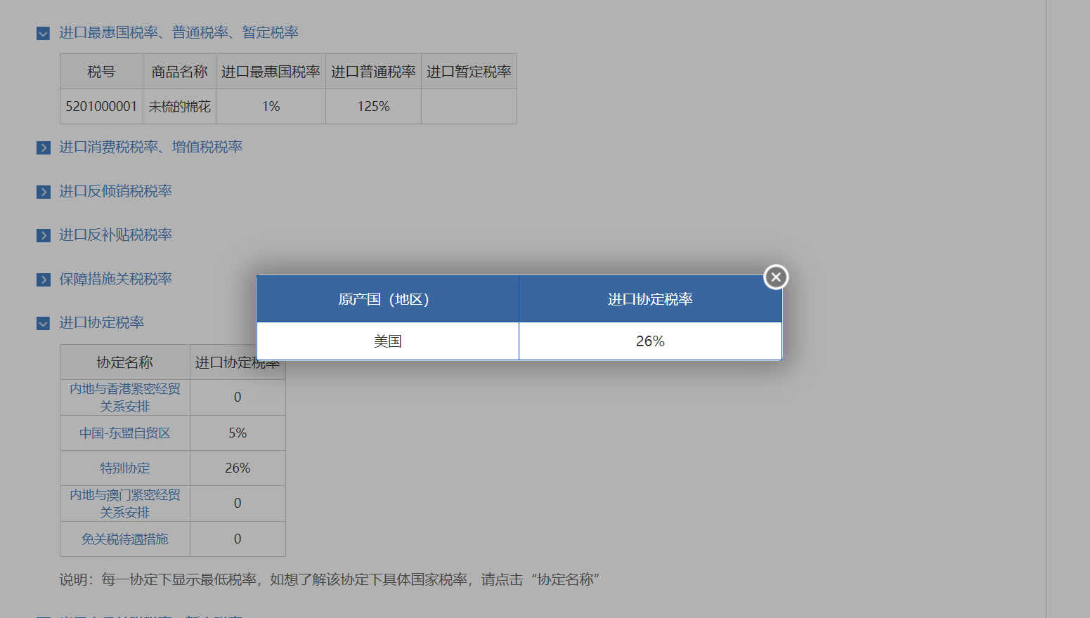 以自美进口商品5201000001“未梳的棉花”为例,输入进口国中国的商品税号。