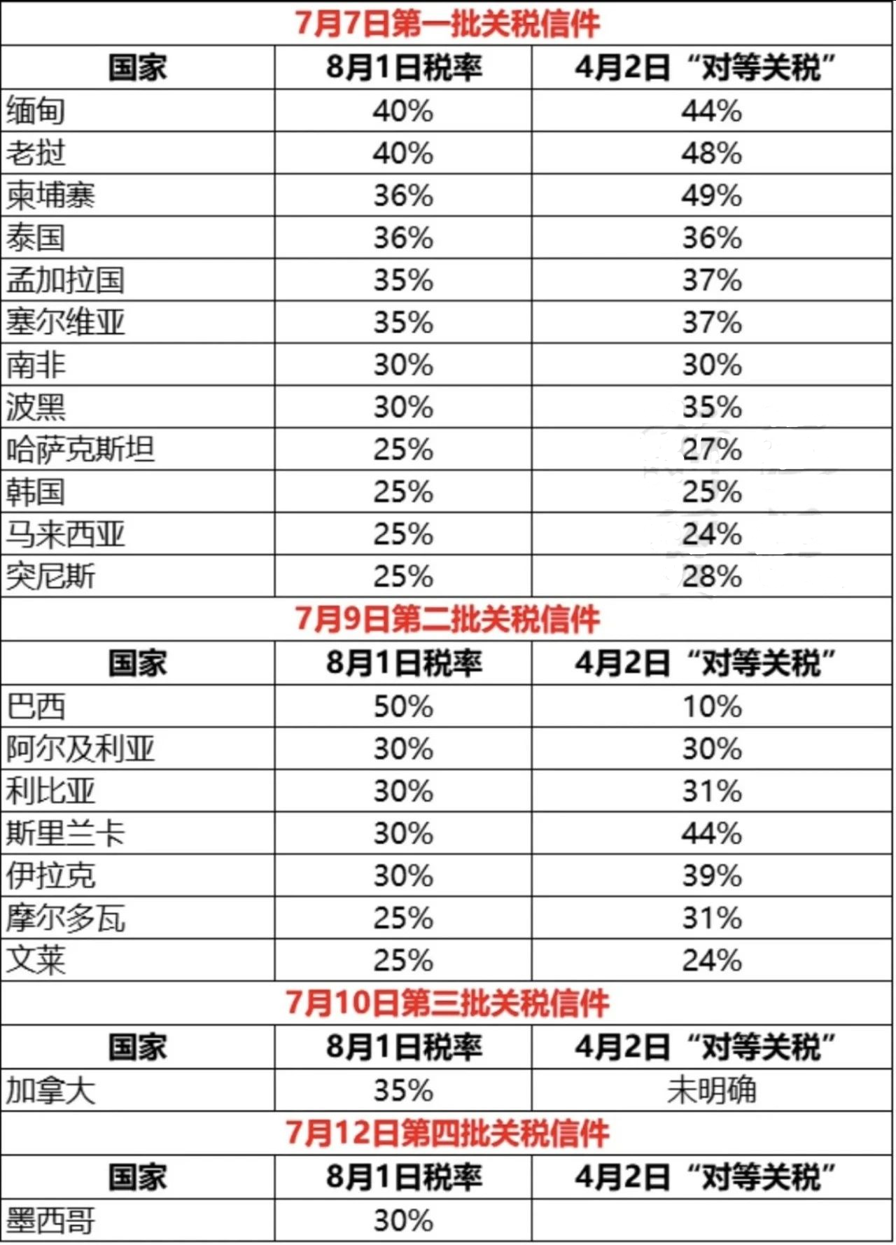 截至7月28日,美国对全球对等关税最新税率情况如下: