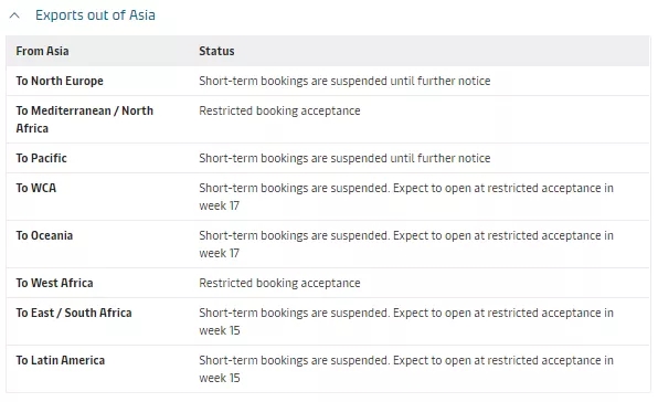 由于船期的延误和不确定性,航运公司不得不向亚洲出口商通报从4月中旬到5月中旬的一些“技术性”取消的航班。